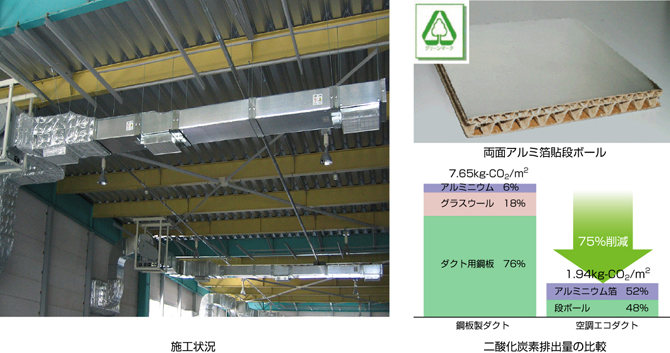材料は,厚さ8mmの段ボールと厚さ20μmのアルミニウム箔で構成されています。このダクトの単位重量は約1kg/m2であり,従来の鋼板製ダクトと比べて約5分の1です。