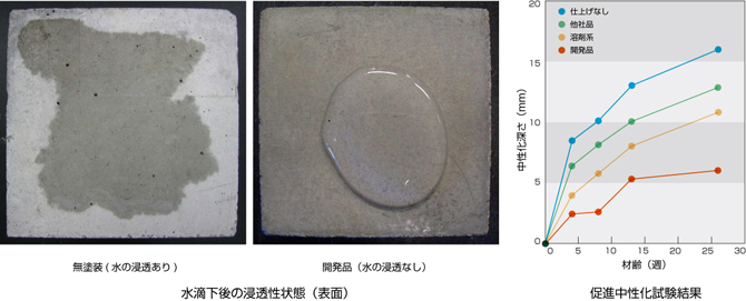 開発した水系ふっ素樹脂クリヤ塗装仕様は,中塗りを2回塗り以上とすることにより中性化抑制効果が高いことが分かりました。また,促進耐候性試験の結果から溶剤系とほぼ同等の耐候性があることも確認されました。