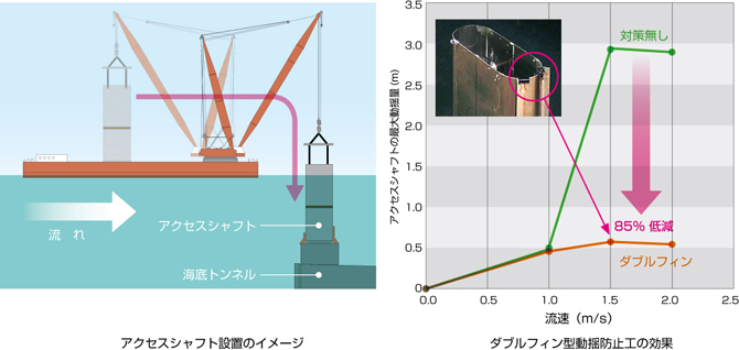 水理模型実験により全6種類の動揺制御工法を確認した結果,ダブルフィン型動揺制御工法に最も高い効果が得られました。ダブルフィン型動揺制御工法は,無対策時に比べてアクセスシャフトの動揺量を85% も低減できることが示され,安全で円滑な工事の実施が可能になりました。