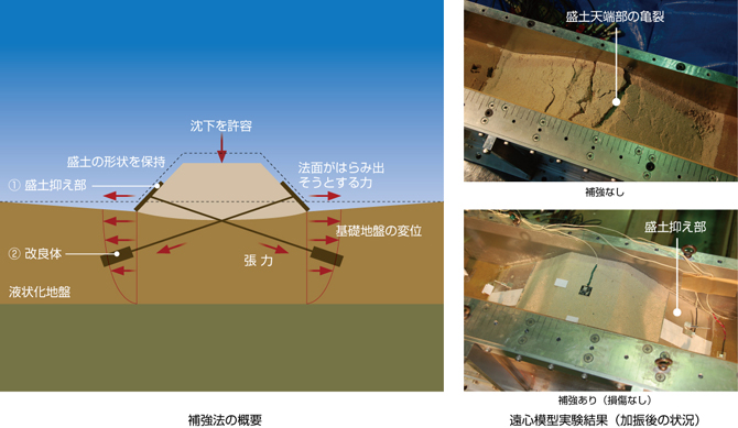 本補強法は,液状化地盤内に改良体を配するなど新規性が高く補強効果を確認する必要があることから,地盤の液状化分野で実績のある遠心力載荷模型実験を実施しました。その結果,無補強で盛土が破壊に至る実験モデルに対し補強を施すことにより,盛土天端部に損傷が見られないなど補強効果が確認されました。また,同時に設計法を確立する上で重要となるアンカー張力のデータも取得することができ,今後はこれらを含めた定量的な評価を行ない,本補強法の実用化を目指す予定です。