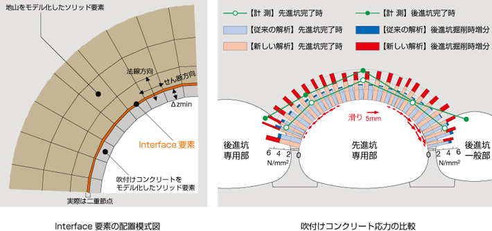 本研究で実施した三次元逐次掘削解析では,吹付けコンクリートの材齢による弾性係数の変化,および滑りや剥離といった支保と地山間の境界面における挙動を表現できます。吹付けコンクリートの弾性係数は,吹付け後の材齢に応じて逐次変化させます。また,吹付けコンクリートをモデル化したソリッド要素と,地山をモデル化したソリッド要素を分離し,その境界面にInterface要素を挿入します。Interface要素が,法線方向には,圧縮のみ抵抗し,引張には抵抗しないことで,支保と地山の剥離を再現し,せん断方向には,最大摩擦力以上には抵抗しないことで滑りを再現します。
