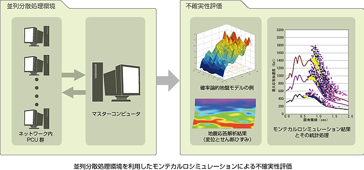 地盤物性のばらつきが地震時の地盤の非線形応答に与える影響を検討するためには,モンテカルロシミュレーションの適用が有効です。しかし,モンテカルロシミュレーションには多大な計算負荷がかかるために,計算の効率化が必要となります。本研究では,モンテカルロシミュレーションを実施するための並列分散処理環境を構築し,その効率化を図りました。また,数値計算の効率化を図った結果,多様な条件に対するモンテカルロシミュレーションを実行することが可能となり,幅広い条件に対して地盤物性のばらつきと地震時の地盤の応答のばらつきの関係を具体的に把握することが出来ました。