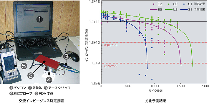 塗膜の交流インピーダンスを経時的に測定し,単回帰分析することにより,鉄鋼面塗装材の塗膜寿命を予測します。これまでの目視による劣化度の評価では定量的な診断が難しく、診断結果にエキスパートの判断が必要で個人差がありましたが、個人差が出にくく定量的に評価することができます。