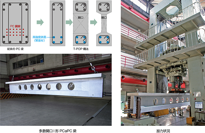 地球環境への配慮から建物の長寿命化が望まれており,将来の用途変更やレイアウト変更に対応できる大スパン空間が求められています。大スパン空間を構築する技術として,プレキャストプレストレストコンクリート(PCaPC)梁を用いたT-POP構法を開発し,実施適用しています。今回,T-POP構法での梁断面の更なる縮小と部材の軽量化を目的に,超高強度コンクリートの使用とI形断面形状および多数開口による超軽量PCaPC梁を開発しました。