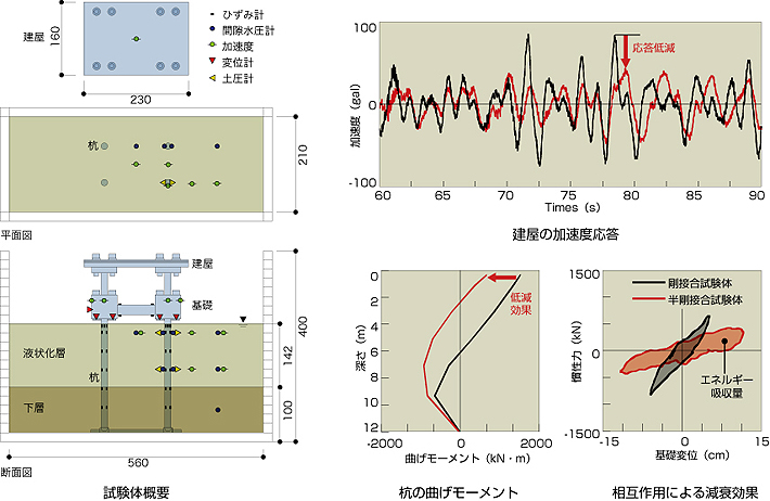 杭頭半剛接合構法を採用した杭基礎建物と液状化地盤の模型振動実験