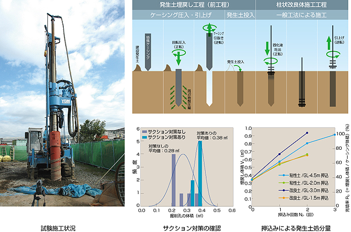 試験施工の結果,柱状改良体の品質が所定の管理値を満足すること,ケーシング引抜き時に掘削孔内に発生するサクションを緩和することで掘削孔が縮小するのを防止出来ること,掘削位置で数回押込みを行うことで発生土の処分量が増加することなどが得られました。今後は産廃土を対象に本工法を適用していきたいと考えています。