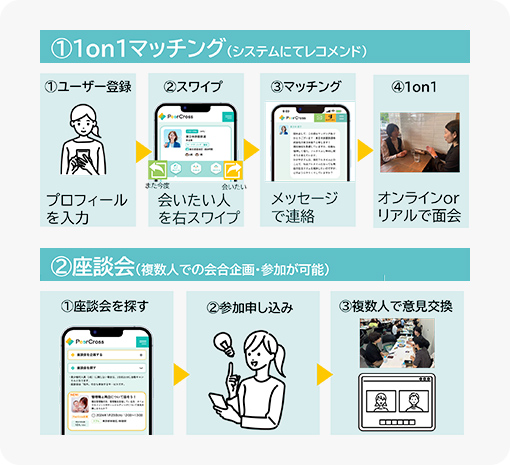 - 5段階のキャリアの価値観に合わせて近しい価値観のお相手をレコメンド。価値観、境遇の近い方にキャリア・ライフについて相談できる