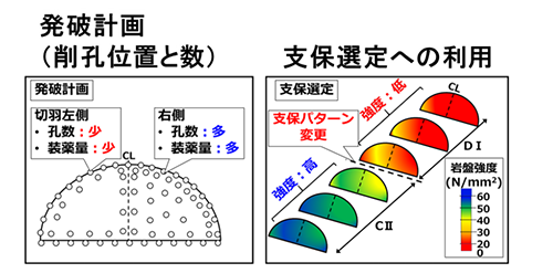 切羽の岩盤強度分布を可視化することで、定量的な岩盤評価に基づく支保選定などの施工判断や関係者間での合意形成をスムーズに実施することができます。例えば、トンネル掘削方向に対する岩盤強度の連続的な変化を的確に把握できるため、支保パターン変更の根拠資料の1つとして活用することが可能です。また、これらの定量的な評価データを蓄積し掘削実績と比較検証することで、切羽の岩盤強度に応じた発破計画(削孔位置、削孔数、装薬量など)への活用なども可能となります。