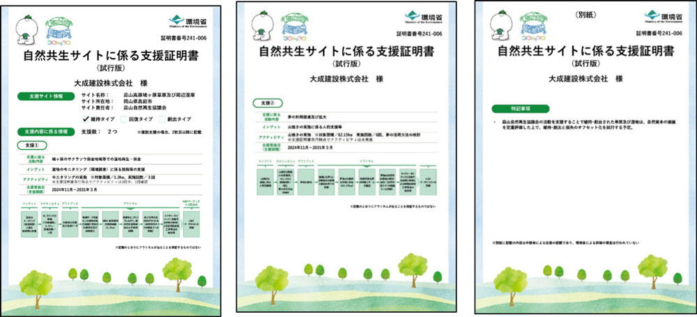 今回、当社が支援した「蒜山高原鳩ヶ原草原及び周辺湿原」(岡山県真庭市)では、湿地のモニタリング技術等の提供や、山焼きに関する人材支援などを実施しました。こうした実践的な支援活動が評価され、環境省の「自然共生サイトに係る支援証明書(試行版)」を取得しました。この証明書は、全国で初めて認定された11件の1つとなりました。