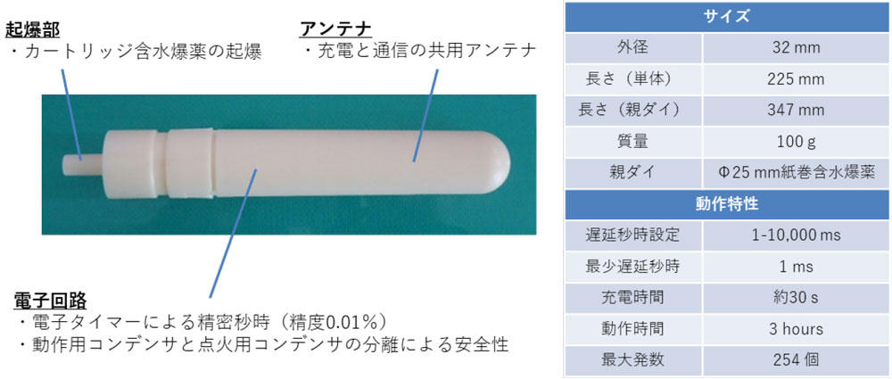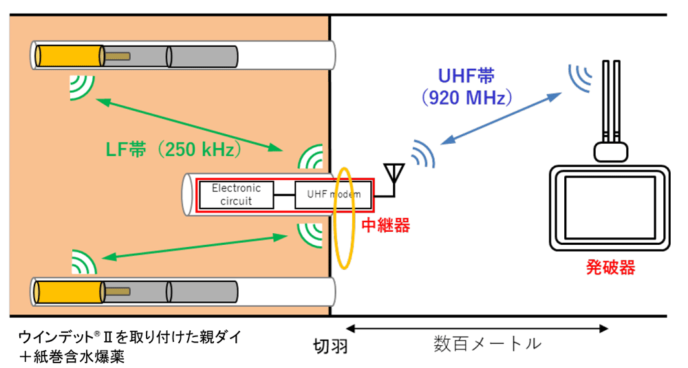 発破作業に使用する雷管はこれまで有線式が使用されており、装薬後に雷管から伸びる脚線をすべて手作業によりつなぎ合わせる必要があるため、岩盤の肌落ちリスクのある切羽近傍での作業に時間を要することから、安全性や生産性に課題がありました。