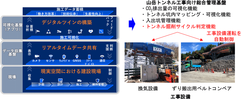 大成建設株式会社(社長:相川善郎)は、「生産プロセスのDX」の一環として、建設現場の施工管理業務を支援する統合プラットフォーム「T-iDigital Field※1」に山岳トンネル掘削作業の進捗状況に合わせて坑内の換気設備や掘削土砂搬出用ベルトコンベアなど複数の工事設備を自動で運転制御することができる機能を追加しました。今回追加した機能を用いて、工事設備や施工機械を連携させ運転の最適化を図ることで、電力消費量とCO2排出量の大幅な削減を実現しました。