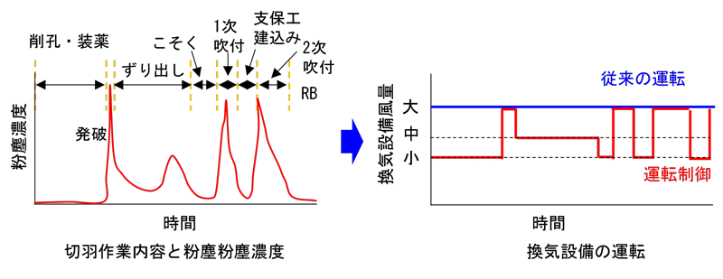 山岳トンネル工事では、掘削サイクル※2を繰り返しながらトンネルを構築しますが、掘削サイクルにより、粉塵の発生量が異なることから、切羽後方で稼働する送風機や集塵機などの換気設備運転を最適に行う必要があります。また、ずり出しをベルトコンベアで行う現場では、掘削サイクルの進捗状況によっては、各工事設備の稼働が一時的に集中することで電力使用量が急増し、契約電力量の超過が生じるという課題もあり、建設現場全体の電力消費量を管理する技術が求められていました。