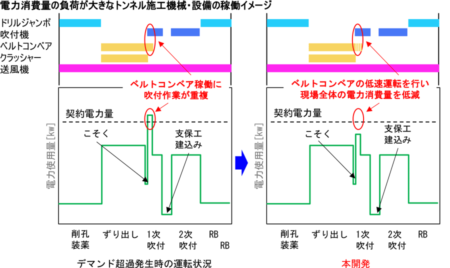 切羽の掘削サイクルの進捗状況に基づき電力消費の負荷が大きい複数の工事設備を連携させて自動で運転制御することで、工事現場全体の電力消費量を管理でき、契約電力量超過を未然に防止することが可能です。