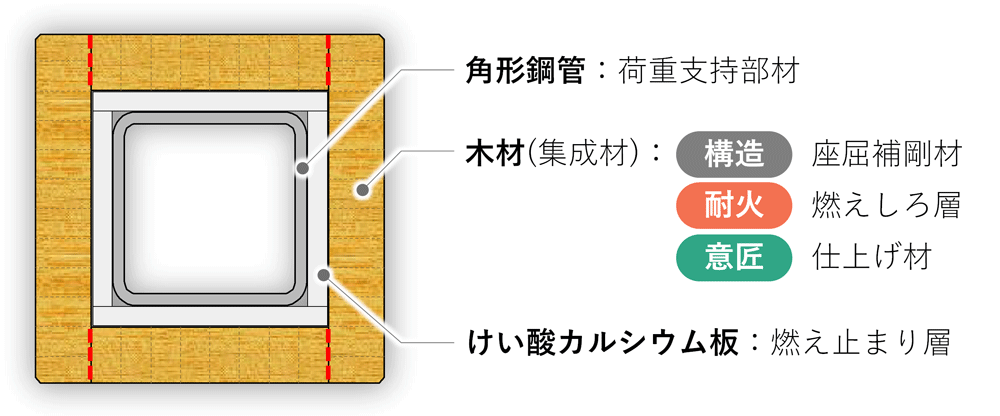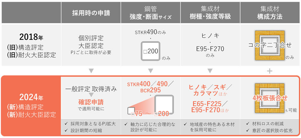 補剛材・燃えしろ層・仕上げ材として使用する集成材は従来、ヒノキ材に限定されていましたが、新たにカラマツ材やスギ材をはじめとする多様な樹種を追加し、樹種に応じた強度等級も選択可能としました。これにより、地域産の特色ある木材の採用が可能となり、また、集成材の構成方法を従来の「コの字二丁合せ」のみから「4枚板張合せ」も可能とし、デザインの多様化を実現するとともに材料ロス削減にも貢献します。