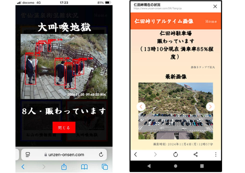 雲仙温泉街の観光スポットにカメラを設置し、カメラ映像を基にAIで解析した人流データをWEB上で配信し、観光客やスタッフが混雑状況を直感的に把握できる仕組みを検証しました。 - 2