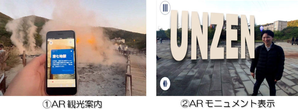 観光スポットの詳細解説を読むことができます。 - ②ARモニュメント表示(UNZENのロゴ)