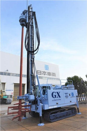 国内初、電動小型杭打機を用いて柱状地盤改良工事を実施