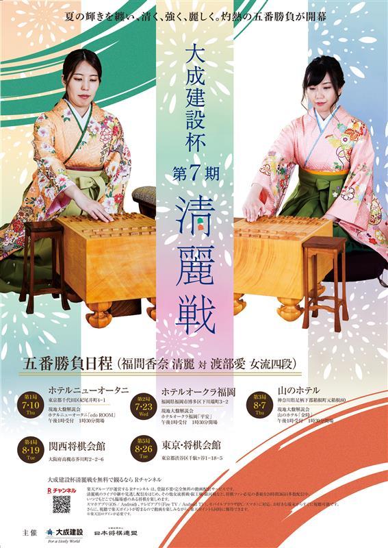 第7期清麗のタイトルを争う五番勝負は、福間香奈清麗に、渡部愛女流四段が挑戦する組み合わせとなり、3勝先取した女流棋士が「清麗」となります。