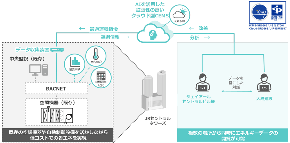 大成建設株式会社(社長:相川善郎)は、「サービス・ソリューションDX」の一環として、既存の空調システム等を改修することなく、AIを活用し最適に運転制御することで、省エネと快適性の両立を低コストで実現できるクラウド型街区エネルギー管理システム(以下、クラウド型CEMS※1:Community Energy Management System)を開発しました。