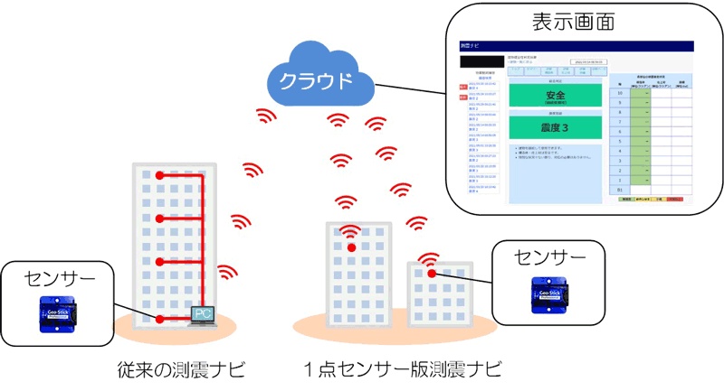 このたび当社は、従来のシステムに加え、より簡易に導入できるシステムとして、1点センサーを設置するだけで建物の構造健全性を判定できるシステムを新たに開発し、「測震ナビ」ラインナップの拡充を図りました。(図1参照)