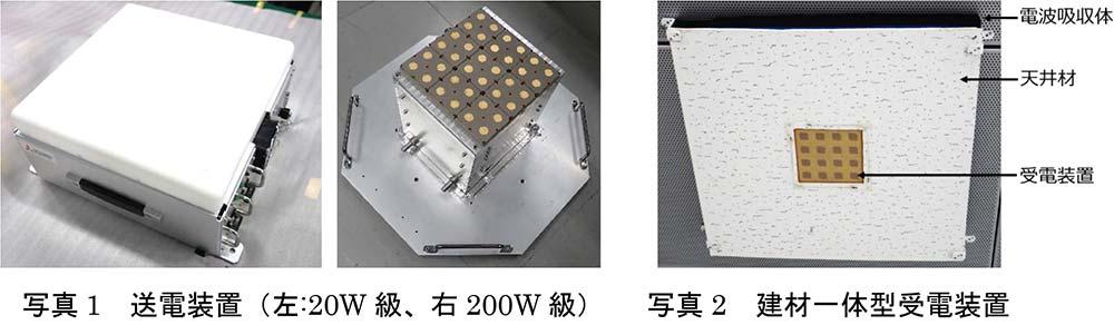 - 送電装置:最大出力200W級のマイクロ波ワイヤレス送電装置(三菱電機開発、写真1参照)