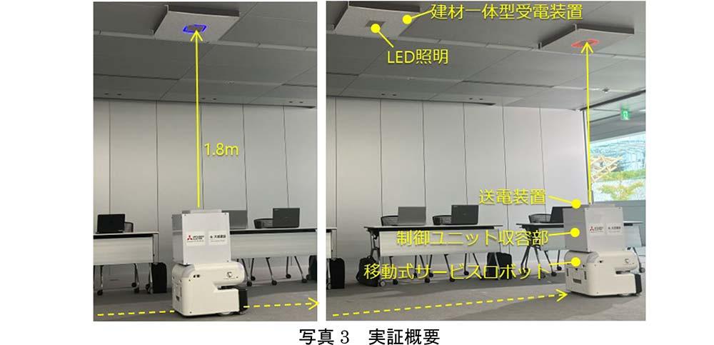移動式サービスロボットに搭載した送電装置から、1.8m離れた天井に設置した2台の建材一体型受電装置へ送電。受電量と漏えい電力を計測(写真3参照)