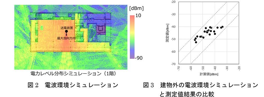 送電装置から受電装置に最大4Wの非接触給電が可能。例えば、消費電力180mW/h程度の環境センサでは、約60分間の給電で24時間稼働が可能となりました。さらに建材一体型受電装置の活用により、周囲への漏えい電力を50%以上低減し、人体や建物への影響を抑制しました。(図1参照) - 2シミュレーションによる電波環境の高精度な予測を実証