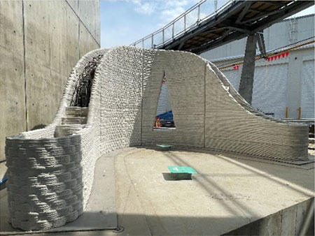| 意匠性 | XYZ軸に同時に動くノズルにより斜面や曲面に沿ってプリントすることで、隆起した地層のような動きのある立体的なデザイン | 多孔質な凹凸デザインにより通風・採光機能を確保し、シンボリックな三角形の大開口を設けることで憩いの場に開放感をもたらすデザイン |