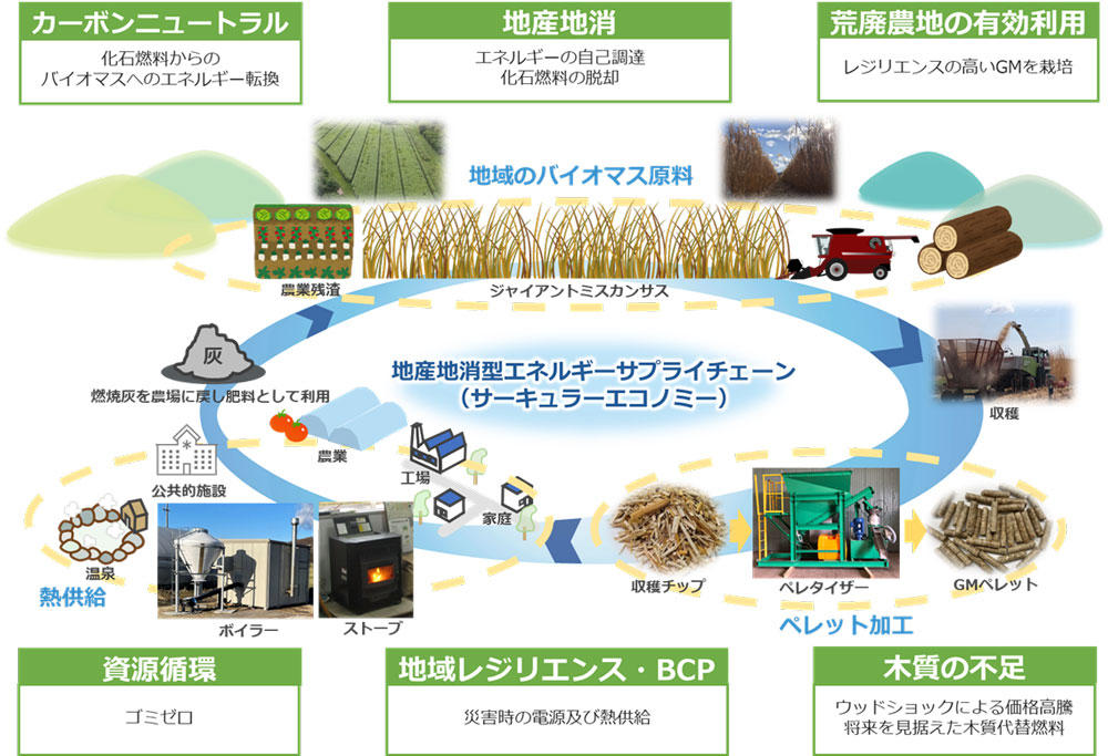 本実証では、GMを収穫後にペレット化することでエネルギー効率を高め、既存のペレットストーブやバイオマスボイラーでの利用を可能としました。これにより、地域内で完結する熱エネルギー供給が実現し、地産地消型エネルギーサプライチェーンの構築が期待されるとともに、さまざまな地域課題の解決に貢献できるものと考えています。