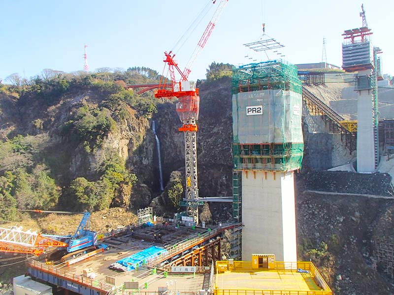 阿蘇への観光ルートであり、市民生活の重要なインフラでもある新阿蘇大橋。開通を待ち望む方々のため、当社は徹底した合理化を図り、長大な橋脚や橋桁の構築においてもスピーディーな施工を実現。昼夜を分かたぬ努力により、全体で約1年4カ月の工期短縮を図りました。