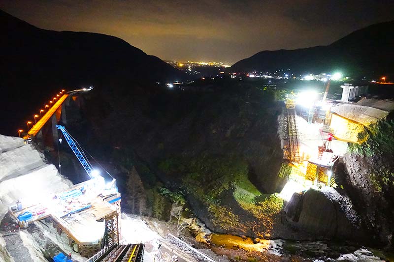 一級河川黒川をまたぐ新阿蘇大橋。急峻な地形や年間を通して吹き渡る強風対策として、雨風の影響を受けにくく、急斜面でも大量の資機材を運搬できるインクラインを両岸に整備しました。最大積載量60tもの巨大インクラインの設置により、厳しい条件下での安全かつ効率的な資機材運搬を実現しました。