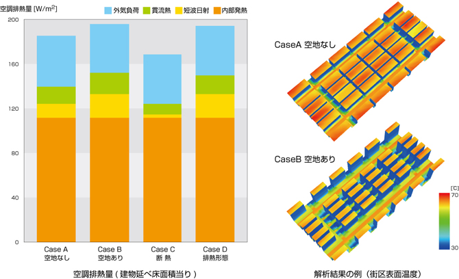 容積の等しい建物を,空地を設け建てた場合,空調排熱量は敷地面積最大に建てたケースより1割ほど増加しました。従来はこのような差を計算することができず,空調排熱負荷は均一に与えるのみでした。空地を設け,更に断熱性を高めた場合,空調排熱量及び屋外温熱空気環境共に良好となる結果を得ました。