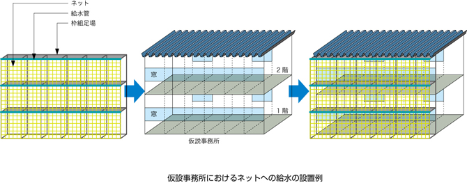 検討した対策は、仮設事務所に併設した枠組足場の外側に張ったネットの上端から、枠組足場の高さにあわせた上下方向の均等間隔に給水管を設置してネットに給水する方法です。この方法は、通常の仮設工事作業と同様に構築から解体撤去までが容易で、繰り返して使用が可能です。また、施工時の枠組足場と工事用ネットが構成部材なので、通常の仮設工事と同様のネット張り作業で構築できます。