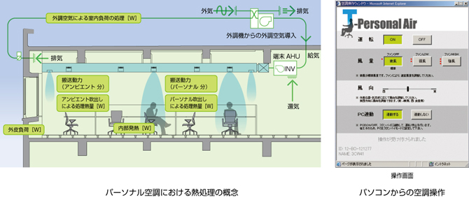 パーソナル空調システムは、個人の好みの温熱環境および在席状況に応じて空調機を調整し、快適性と省エネルギー性を両立させる特徴があります。これらの空調機の調整やON/OFFは、ネットワークによる自席パソコンと吹出しユニットの連携によって制御される仕組みとなっています。この研究では、実際に適用した事務所ビルでの制御状況を把握し、省エネルギー効果を実証することを目的としています。