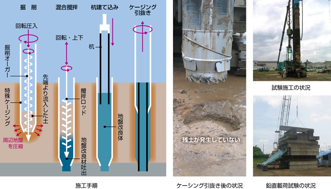 本工法の特徴は,発生残土を低減できることとその支持力性能の高さにあります。発生残土の低減は,先端にテーパーのついた特殊なケーシングを用いて掘削を行い,地盤を側方に圧縮することにより造り出した空間を利用して行っています。支持力性能の高さは,杭の外側に築造した地盤改良体に起因します。この地盤改良体が杭の鉛直支持機構に有効に働き,通常の既製コンクリート杭と比較して,本工法はより大きな鉛直支持力性能を発揮します。