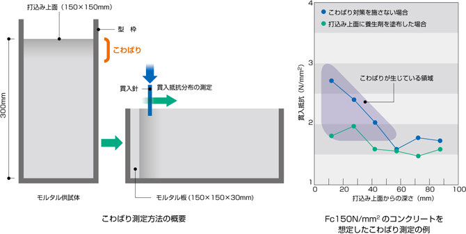 こわばりの測定にはモルタル供試体を使用し,測定時に供試体を90度回転させて,打込み上面から内部方向への貫入抵抗分布を測定します。測定時に,供試体と同時に作製したモルタル板を打込み上面に設置することにより,上面近傍の貫入抵抗を測定することができます。本測定方法では,こわばりが生じることにより,打込み上面付近の貫入抵抗が,それより内部に比較して大きくなるような傾向が捉えられます。また,打込み上面に養生剤等を施すことにより上面の乾燥程度が変化すると,こわばりの固さや厚みも変化してくる様子がわかります。