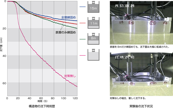 地盤の深い領域に未改良のゆるい地層を残しつつも,建物直下の浅い領域をある程度の深さまで締固めることによって,まったく締固め地盤改良を施さない場合に比べれば,地震時の直接基礎建物の沈下量を大幅に低減できることが確認されました。