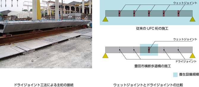 従来のダクタルを用いたプレストレストコンクリート橋では,接合面の精度を考慮し,部材同士の接続部に,現場で練混ぜたダクタルを打設するウェットジョイント工法が採用されてきました。しかし,ダクタルの練混ぜ設備や強度発現を促す養生が必要となり,架設工程の長期化あるいは架設コストが高くなることもあります。そこで,これらを低減するために,従来より簡易に部材を接合できるドライジョイント工法を開発しました。また,上部工の軽量化だけでなく,建築限界等の制約により桁高が制限された箱桁断面の場合,セグメント製作時の内型枠の脱型効率が悪くなります。そこで,ダクタルを用いた低桁高断面の内型枠を効率的に脱型できる技術を開発しました。