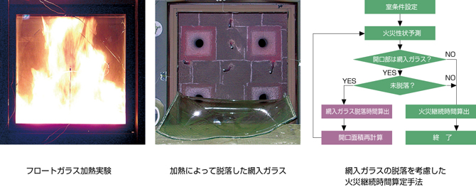 本研究では建築物の避難安全性能検証を行うためのフロートガラスの遮煙性能や,耐火性能検証を行うための網入ガラスの脱落時間,脱落面積等の検証用データをガラスの加熱実験により収集しました。加熱は放射加熱,ガスバーナー,耐火炉による直火加熱によって行っています。合理的な設計を行うために,これらのデータを取り入れた設計手法を構築する予定です。