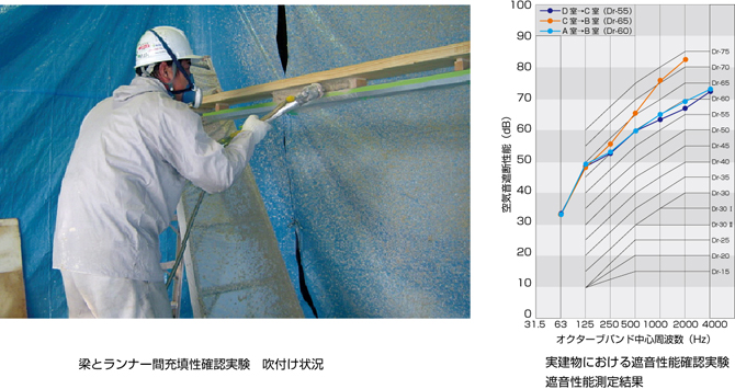 比重が高いセラミック系湿式耐火被覆材に着目し,梁下に遮音用通しアングルを取り付けることなく,遮音壁としての性能が得られるか実験的に検討を行いました。実験室での結果において,高周波数帯域において若干の遮音性能の低下が見られましたが,評価上は十分な遮音性能を保持しており,遮音壁としての性能を大きく低下させないことが示されました。また,実際のホテル現場に,メーカーカタログ値でTLD-60仕様の壁と,本納まりを適用した結果,上図に示すように室間音圧レベル差等級Dr-55~65と高い性能が得られることが確認できました。