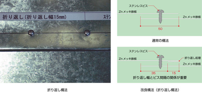 これまでの研究により,スリット状接続構造の電磁シールド性能は,「スリットの全長」「ビス等による固定の間隔」「重ね合わせの幅」「重ね合わされた材料間の導電性能の程度」「同部位の(施工不良により発生する)隙間の程度」の組合せにより決定されることがわかりました。改良構法の開発に際して,これらの知見を基に同構造の「重ね合わされた材料間の導電性能の確保」「同部位の隙間の低減」を達成するための複数の改良案を検討しました。