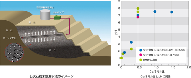 石灰石粉末懸濁水注入法は,黄鉄鉱含有の掘削ずりを無対策で盛土(または,埋土)したことにより発生した硫酸酸性水抑制のための事後対策です。硫酸酸性水の発生を抑制する必要のある領域に,ボーリング孔等を利用して,石灰石粉末の懸濁水を注入し,対象領域を中和します。石灰石を使用することの長所としては,多量に施用してもpHは8~9程度の上昇で止まるために,施用後に周辺環境をアルカリ汚染する可能性がないことが挙げられます。