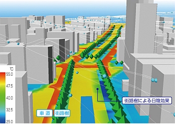図-1は都市部の街路部分の温熱環境を解析した例で街路樹による日陰効果を確認できる。