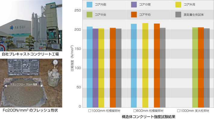 試験室実験により,密実な充填を実現するための高い流動性と分離抵抗性,さらに優れた強度発現性を持つ超高強度コンクリートを開発しました。自社工場の製造設備を用いた実製造検討実験により,構造体コンクリート強度が200N/mm2を超える実大柱部材の製造を実現しました。また,蒸気養生が終了した時点(材齢7~14日程度)で,部材とともに蒸気養生した供試体により構造体コンクリート強度管理が行えるため,要求される強度特性を満足していることを確認したプレキャストコンクリート部材を早期に現場で取り付けることも可能になると考えられます。