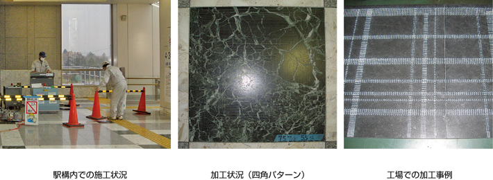 レーザノンスリップ工法は,約1000m2の実績があり,東京都内駅コンコースに適用され,施工後3年経過しても防滑性が保持されています。技術に関する優位性は以下のとおりです。