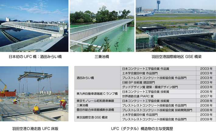 2002年に建設した「酒田みらい橋」は,日本初のUFC橋であり,部材厚を従来の約1/5となる5~11cmに抑え,大幅な軽量化と50mのスパンを実現致しました。この際の開発技術やデータを基にして,2004年に土木学会よりUFC指針(案)が刊行され,UFC構造物の適用普及の礎を築きました。その後も開発・適用を進めており,羽田空港の再拡張工事においては,大型の道路橋や新設滑走路の床版の一部(192,000m2)にUFCを適用しております。