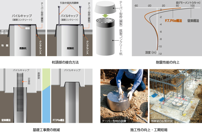 F.T.Pile構法(杭頭半剛接合構法)は,杭頭の曲げモーメントを低減することによって,杭基礎の耐震性能を向上させるとともに,杭や基礎梁の合理化,掘削土量の削減など,基礎工事のコストダウンを可能にします。杭頭接合部の施工は,杭頭部にテーパー型枠を設置することでほぼ完了するため,通常構法(剛接合)と比較しても施工性が良く,低コストかつ短工期で杭頭半剛接合構法のメリットを得ることができます。