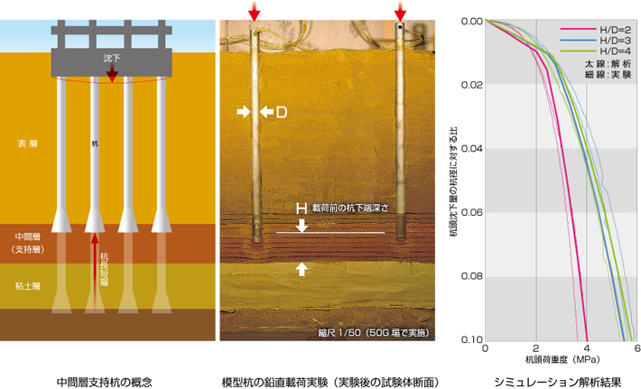 杭の先端の鉛直支持力特性は,杭下端以深の支持層の厚さと相対密度に影響されます。杭の先端の荷重~沈下量関係を,建築基礎構造設計指針に示される場所打ち杭の設計推奨式と,2層地盤の支持力式などから推定する手法を提案しました。また,この関係をFEM解析に組み込むことにより,中間層支持杭の沈下挙動の評価が可能であることを,遠心模型実験により実証しました。
