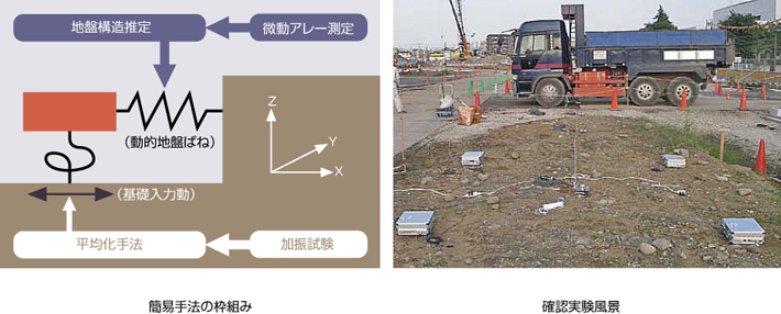 本手法では,剛体基礎上の建物を対象とし,基礎位置付近に設けた複数の測定結果に平均化手法を適用して剛体基礎の基礎入力動を求めます。基礎重心の応答変位は,重心での基礎入力動に相対変位および相対回転を考慮して作成した運動方程式より求められます。また,地盤構造は,近隣のボーリングデータを元に微動アレイ観測結果を用いて修正することで推定します。実際の具体的な手順としては,基礎建設前の更地状態において,大型車両走行等の基礎想定位置での振動測定と,微動アレイ観測を行い,地盤及び基礎入力動・基礎応答を短時間で導く手順となっています。