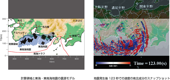 21世紀中頃にも起こると考えられている東海地震・東南海地震・南海地震といった巨大地震では,長周期地震動が発生すると考えられます。長周期地震動は,遠方の平野まで減衰せずに伝播し,平野の堆積地盤の三次元構造により複雑に増幅され,超高層ビル,長大橋,石油タンク等の固有周期の長い構造物を大きく揺らすと予測されます。超高層ビルの設計や制震補強などの検討用地震動として,これら巨大地震の長周期地震動を精度良く算定しておくことは重要です。